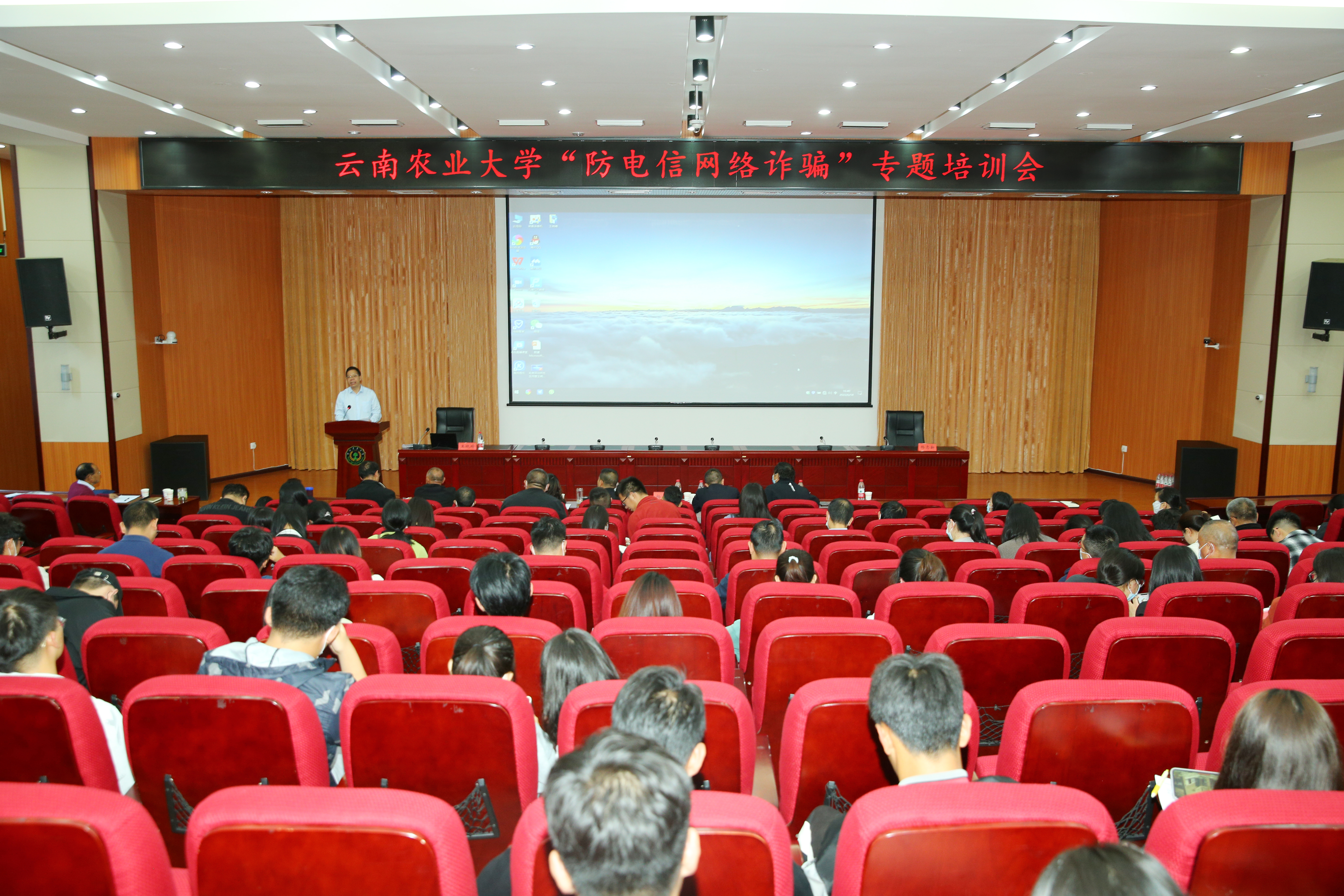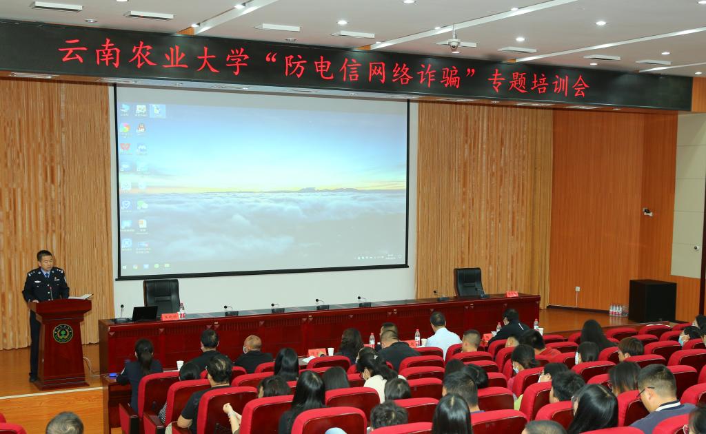 为进一步增强师生对电信诈骗的防范意识和辨识能力, 普及防诈骗知识,切实保护广大师生的生命财产安全,构建平安校园。2022年6月14日,保卫处、学生处联合盘龙区龙泉街道办、龙泉派出所、司法所在耕读楼二楼报告厅共同举办“防电信网络诈骗”专题培训会。云南农业大学杨生超副校长出席会议并提工作要求,龙泉街道办党委书记刘国强、龙泉派出所所长焦德灵、龙泉街道办司法所所长濮永存、云南农业大学保卫处、学生处相关老师、各学院分管学生工作的副书记、团委书记、辅导员、学生代表200余人参加了培训。培训会由学生处副处长杨志新主持。